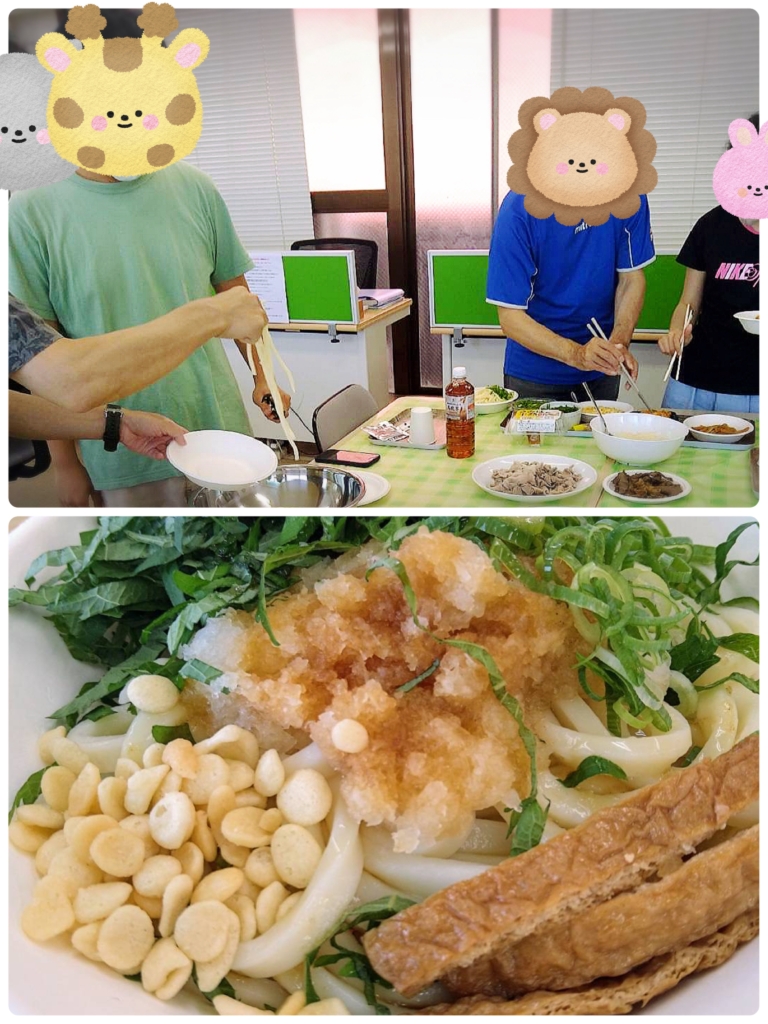 本日のイベントは色々なトッピングをしたうどんでした!暑い日の昼ごはんには、冷やしうどんがピッタリですね。